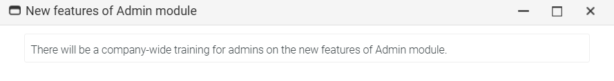 The News widget displays company news created by a system administrator from the Admin module. The admin can decide which modules' dashboards can display this news. The news would initially appear in a contracted form as shown in the first image below. To see the entire news, click Read More. The entire news will appear in a separate window as shown in the second image below. For more information on how to set up company news, see the topic My Company - Part 2.