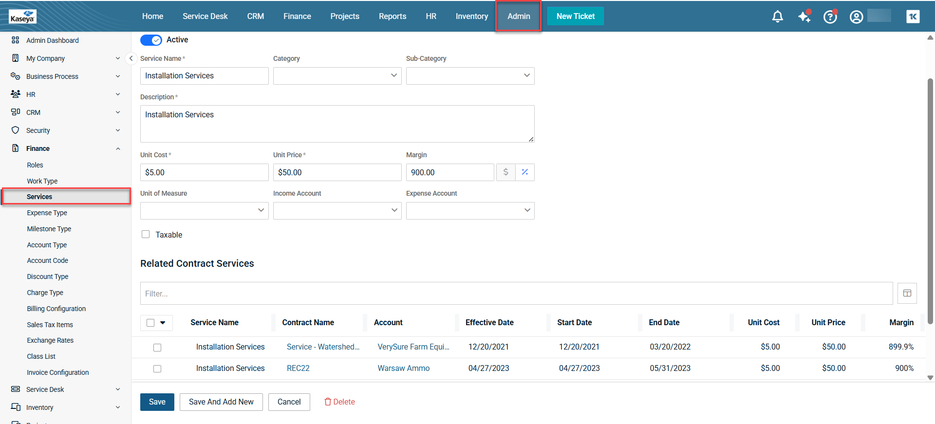 Click Save to create the service. To add another service right after this, click Save and Add New. To cancel everything that you have entered and/or selected so far, click Cancel. Clicking Cancel will take you to the Services page. The Related Contract Services section and Delete will become visible only after you save the service.