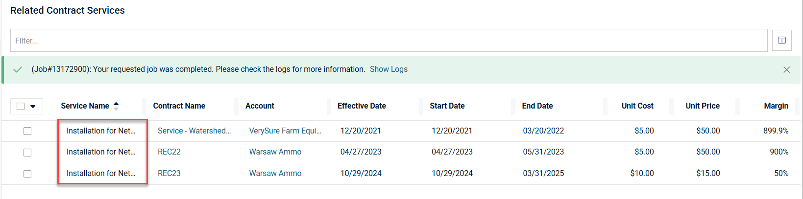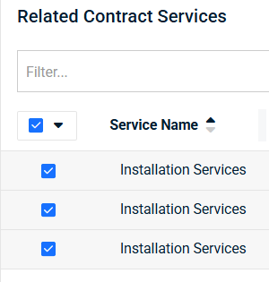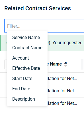 Click Confirm & Update. A green message appears above the Related Contract Services table on executing the request. The green message appears even if the bulk update did not happen. For example, if you have changed the names of the services, you'll be able to see the change in the table after the green message appears.