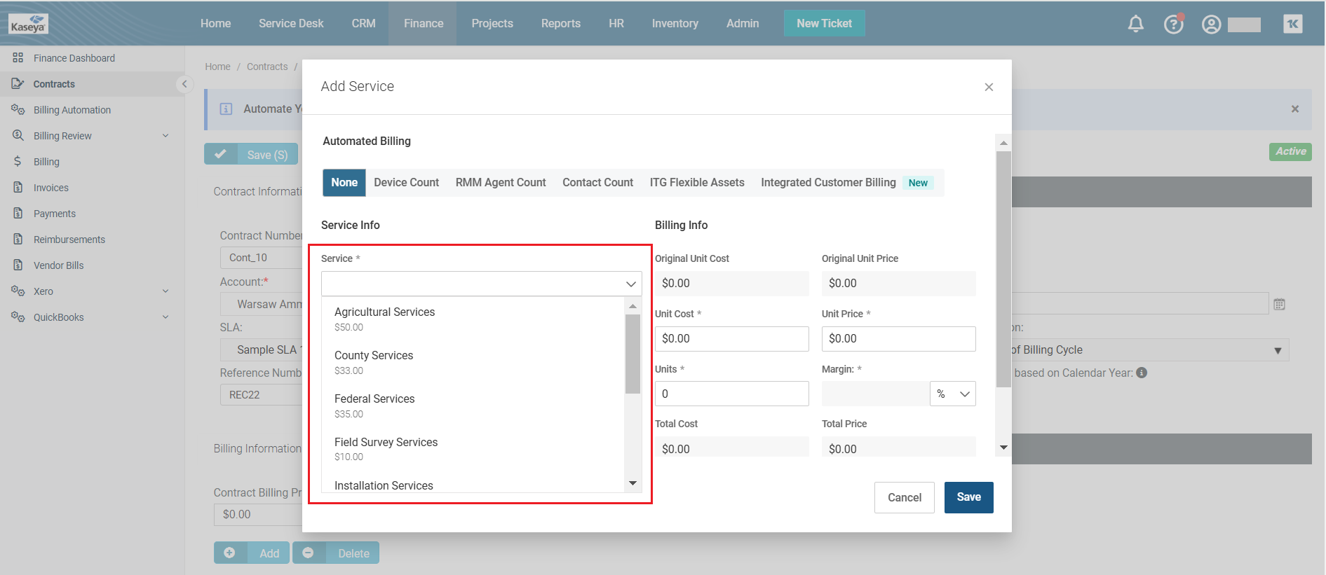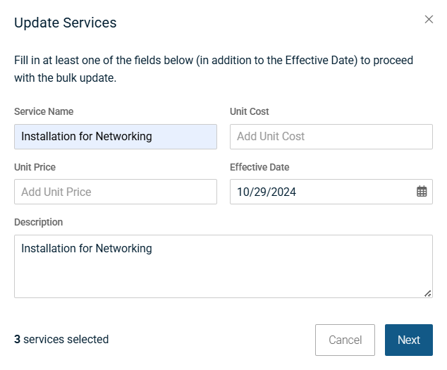 Bulk editing a service linked to one or more contracts allows you to update all relevant service details in a single action, with changes reflected immediately in the associated contracts. This eliminates the need to manually locate and update each contract whenever the service’s cost, price, or name changes.