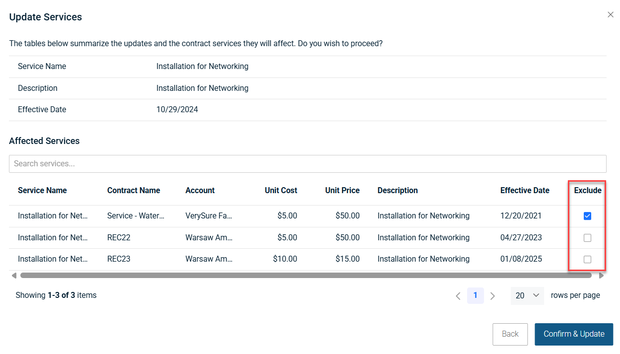 To exclude changes to services tied to certain contracts, select the respective contract's box under the Exclude column under the Affected Services section.