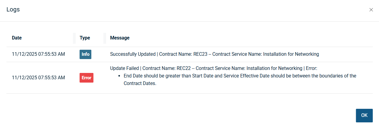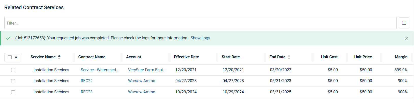 To see whether the bulk update was successful in each contract's case, click Show Logs in the green message.