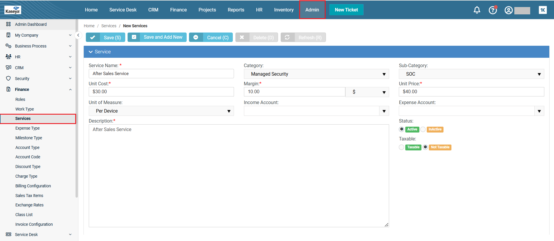 Taxable: By default, the checkbox is not selected. If you want to make the service taxable, select the checkbox.