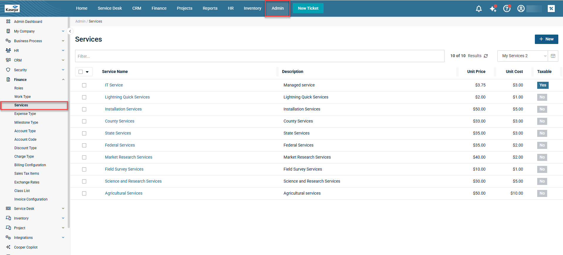 On the Services page, you can create services and see the existing list of services. Once you create a service, you have the option to add it to a recurring service contract from the Contracts page. For details, refer to Recurring services.