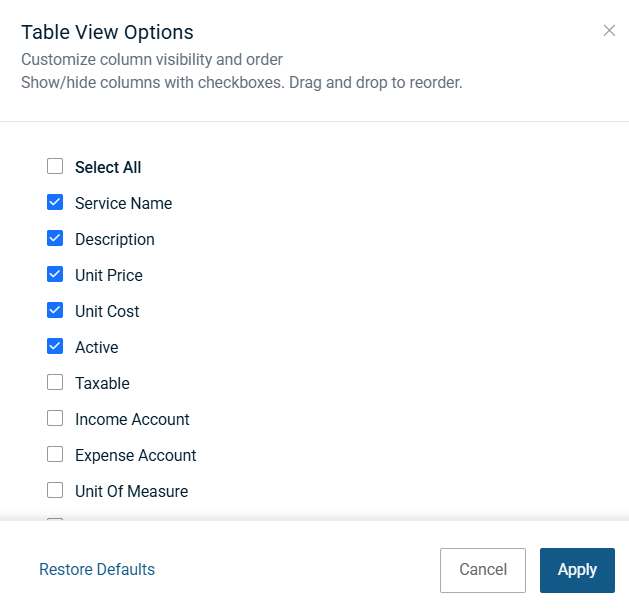 NOTE You can drag and drop columns within the Table View Options window to create an order for the columns to appear.
