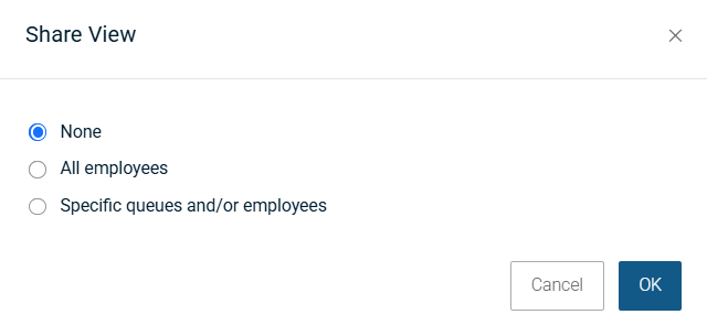 By default, None is selected. Select your option. If you select All Employees, your selected customized view will be shared with all employees of your organization. If you select Specific queues and/or employees, your selected customized view will be shared only with selected queues or employees.