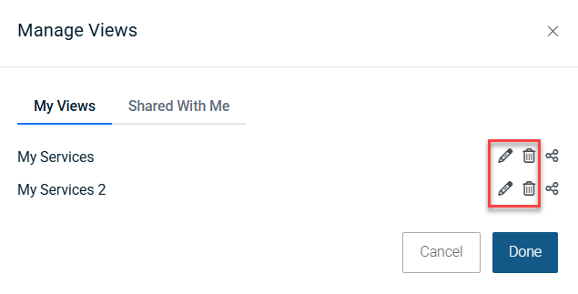 Select Manage Views from the System Default drop-down menu. The Manage Views pop-up opens with two tabs - My Views and Shared With Me. The My Views tab shows your customized views. The Shared With Me tab shows customized views that were shared with you.