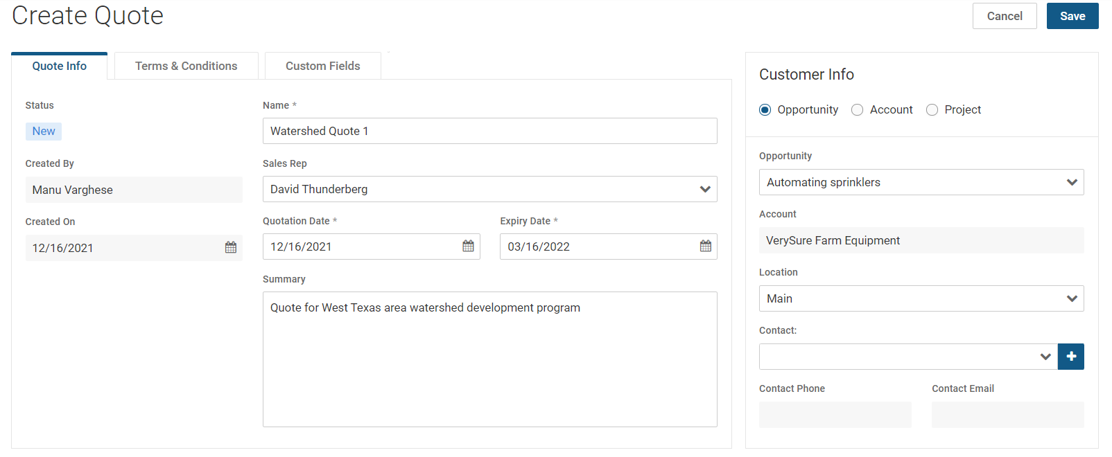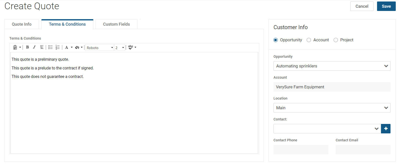 - Customer Info panel: Select Opportunity, Account or Project. By default, Opportunity is selected. If you leave Opportunity as selected, you will see Opportunity dropdown as the first field. You can then select an opportunity from the dropdown. If you select Account, you will see Account dropdown as the first field. If you select Project, you will see Project dropdown as the first field. Whenever you select an item from the first dropdown, the Account and Location fields populate automatically.