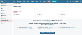 Cooper Copilot (which can be found at Admin > Cooper Copilot) is Kaseya's own AI assistant that provides cutting edge tools to enhance productivity and streamline your workflows. The three salient features of Cooper Copilot are Smart Ticket Summary, Smart Writing Assistant, and Smart Resolution Summary. Tailor these smart features to fit your needs, ensuring that your tasks are managed with precision and efficiency.