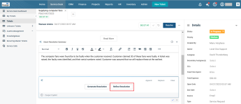 The Smart Resolution Summary feature assists technicians in generating a comprehensive, user friendly, and professional resolution summary by compiling all steps taken during ticket handling. This feature is available at all stages of the ticket. When the text box is open, the Generate Resolution button appears by default. Once the technician start typing in the text box or if the text appears automatically with the help of Cooper Copilot, the Refine Resolution button appears as well.