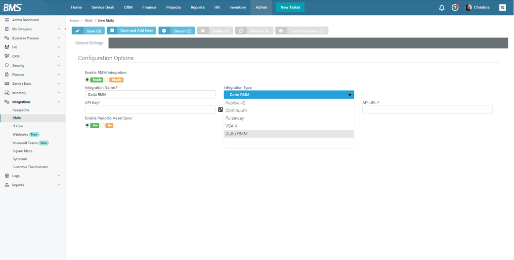 In the General Settings tab, click Integration Type dropdown and select Datto RMM.