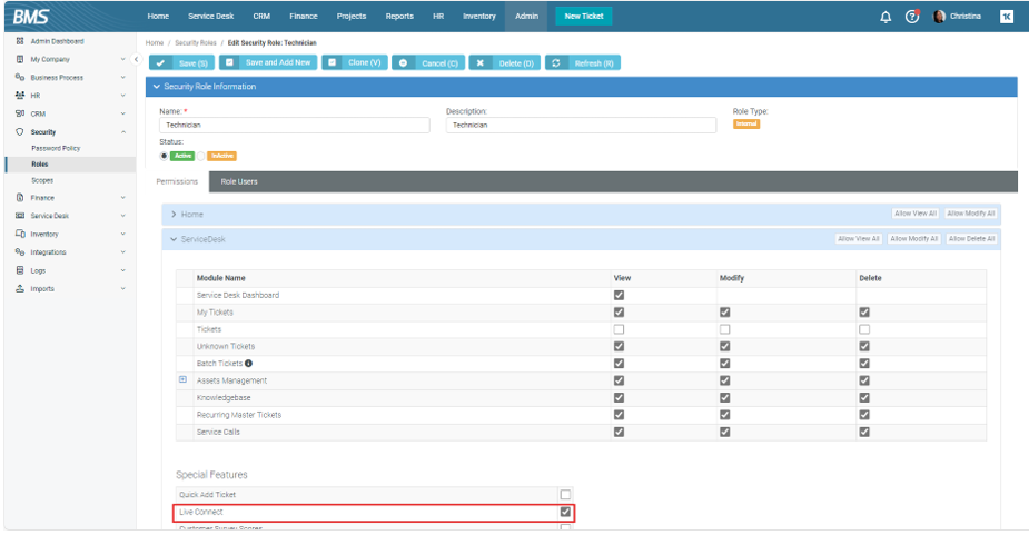 Under Service Desk, enable Live Connect. The role now has access to web remote.