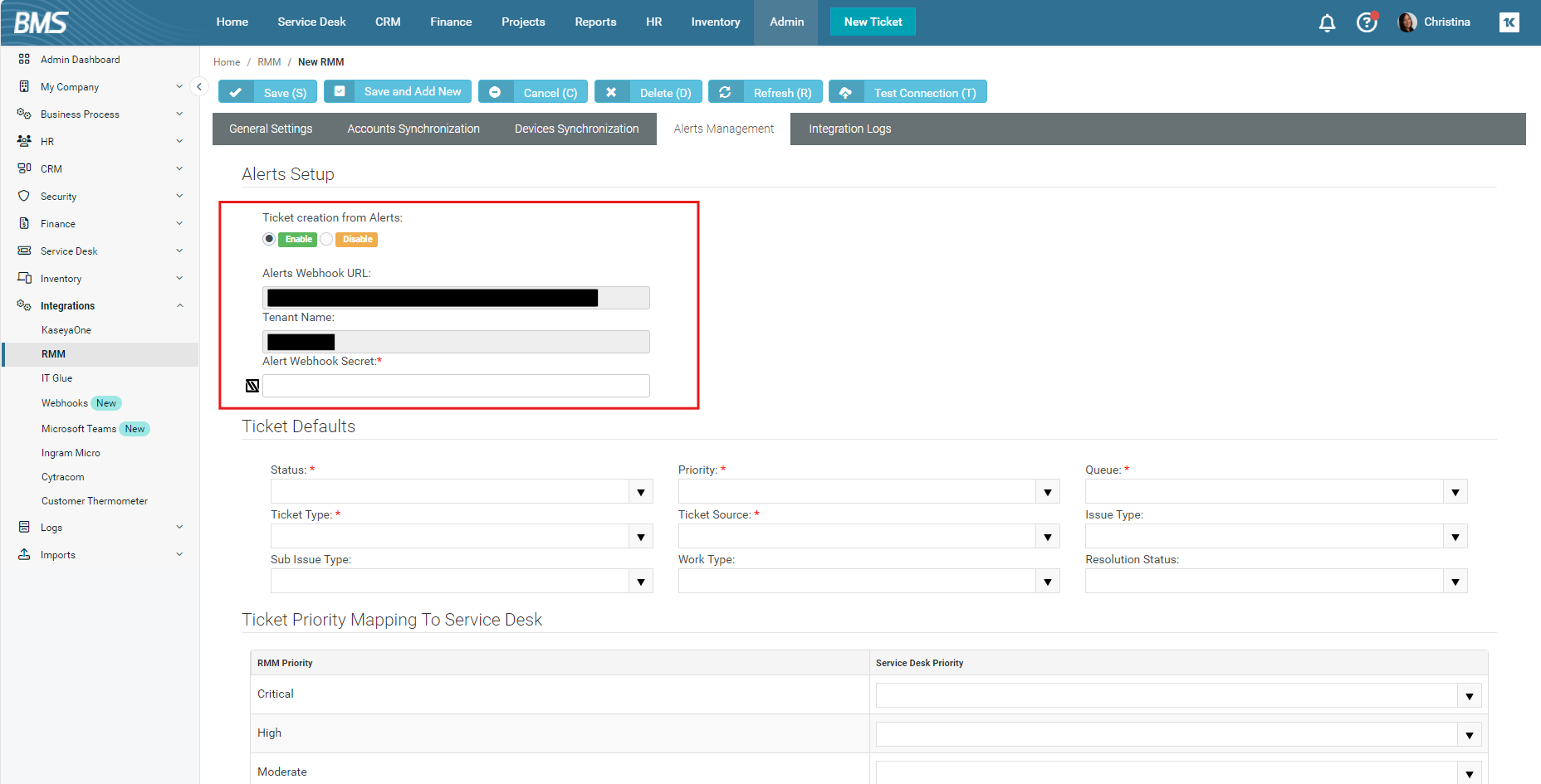 Ticket creation from Alerts: Select Enable to enable alerts to come through to BMS.