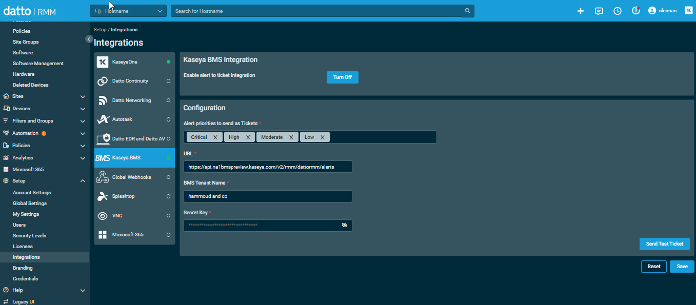 Navigate to Setup > Integrations > Kaseya BMS > Configuration section.