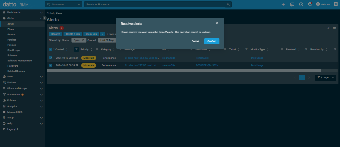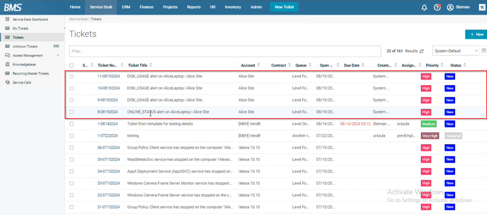 Alerts are linked to a device. Alerts are triggered by certain actions from the Datto RMM side. For example, a new alert from Datto RMM will create a ticket in BMS. If you change the status of an alert in Datto RMM to Resolved, it will update the ticket in BMS and close it.