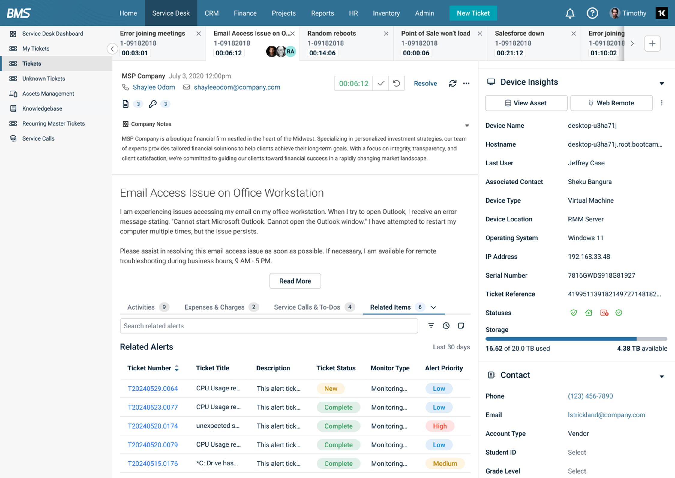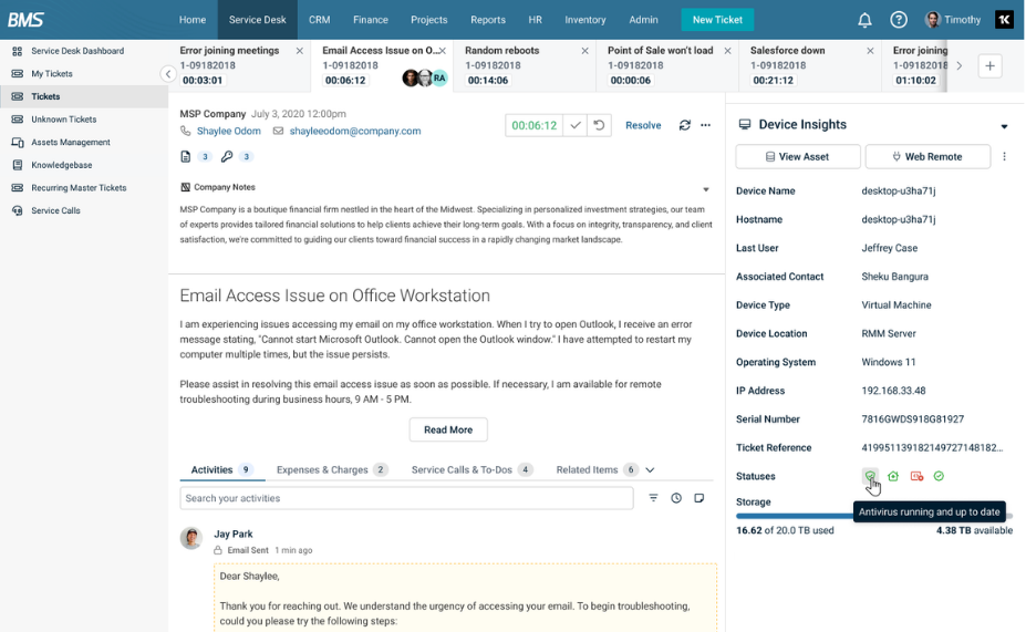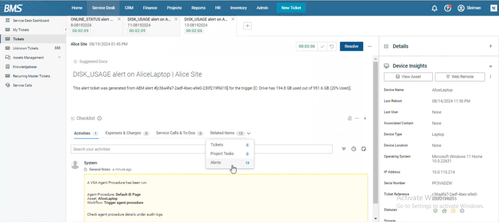The ticket has a new tab on the right panel called Device Insights. The Device Insights tab has replaced the Hardware Asset tab. This tab provides some important information about the device or asset right inside the ticket. The information is provided as a ready reference for taking further action. It also shows statuses which include status of antivirus running in the system, status of patches applied, and status of software updates. The information is routed from Datto RMM. Additionally, you can view the asset and web remote to the asset. You can web remote both from BMS and Datto RMM.