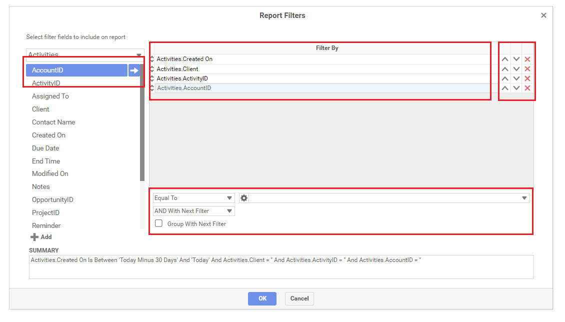 In the CRM Reports page, click the name of the report that you want to view. For example, if you want to view Activities by Account Report, click the name Activities by Account in the list. You will be presented with a Report Filters screen in a new window.