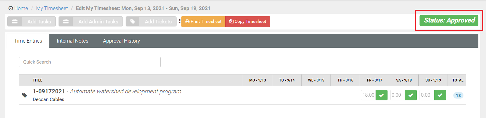 Once you click the Submit for Approval button on the top middle, the status of your time sheet will be reflected on the top right. For example, if the time sheet is approved, it will now show the status as Approved.