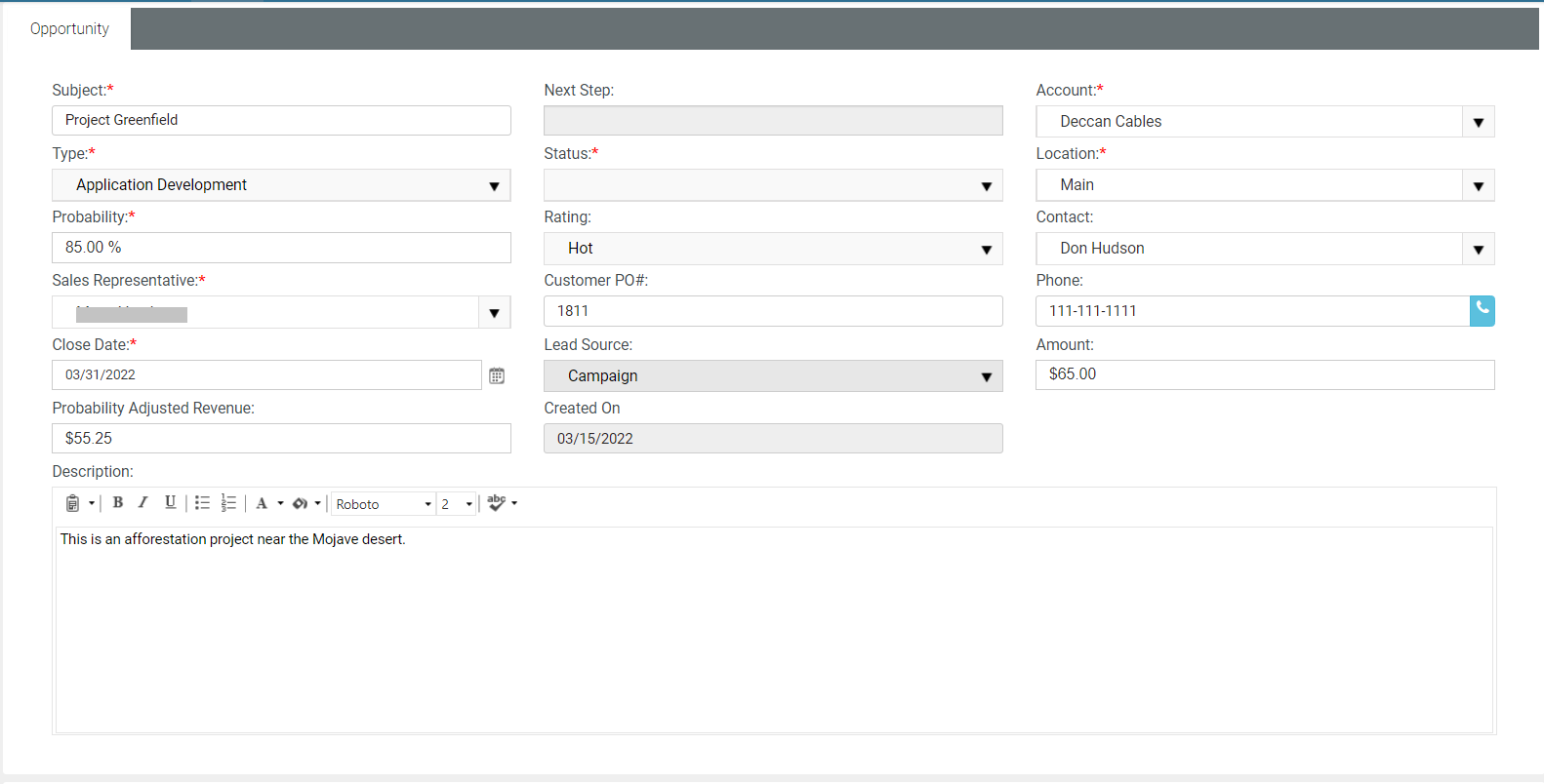 - In the Opportunity tab, make changes wherever necessary. Please remember that Probability Adjusted Revenue and Created on fields are uneditable.