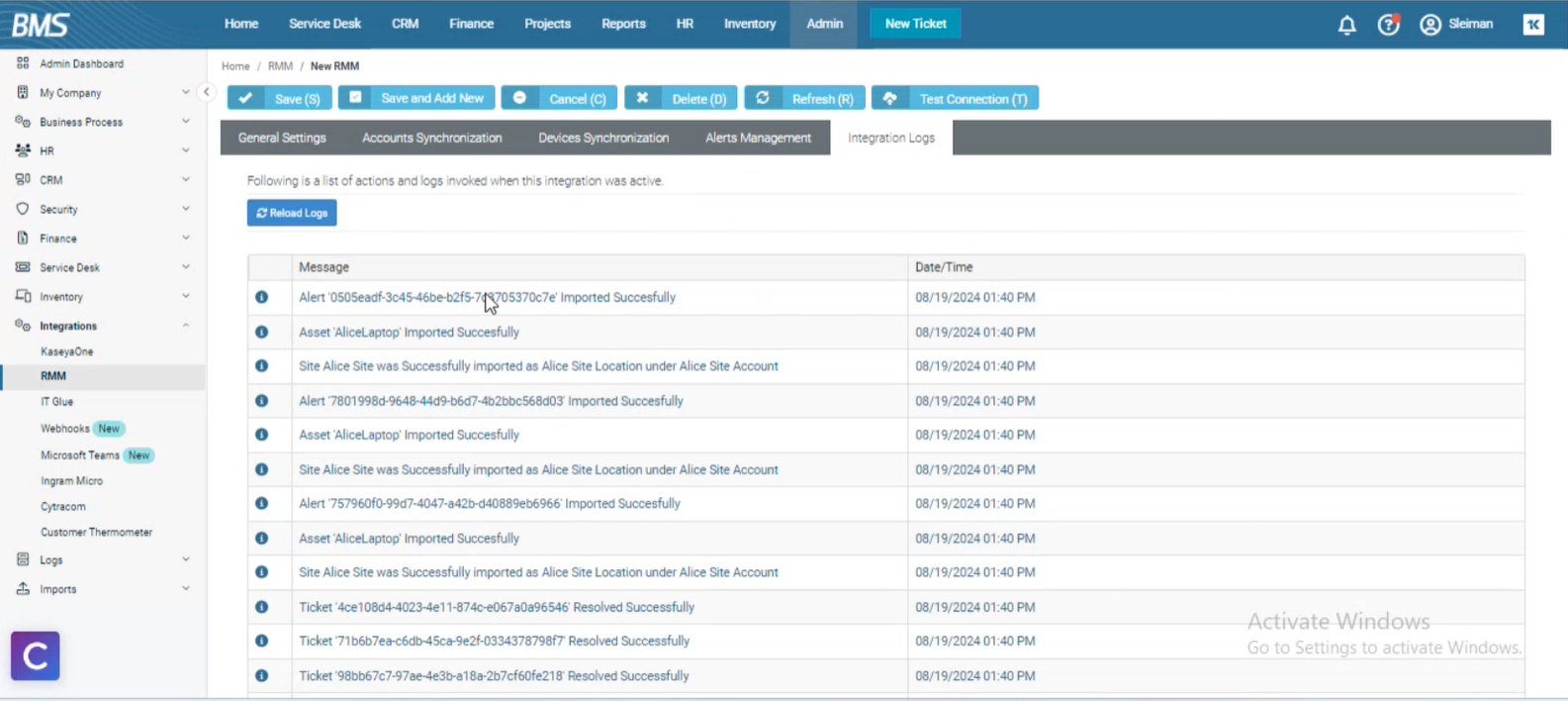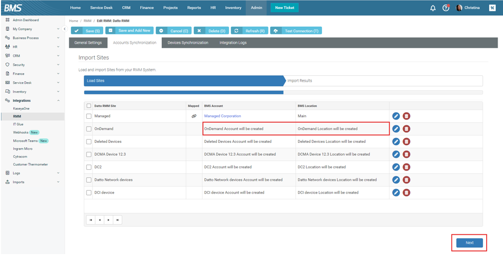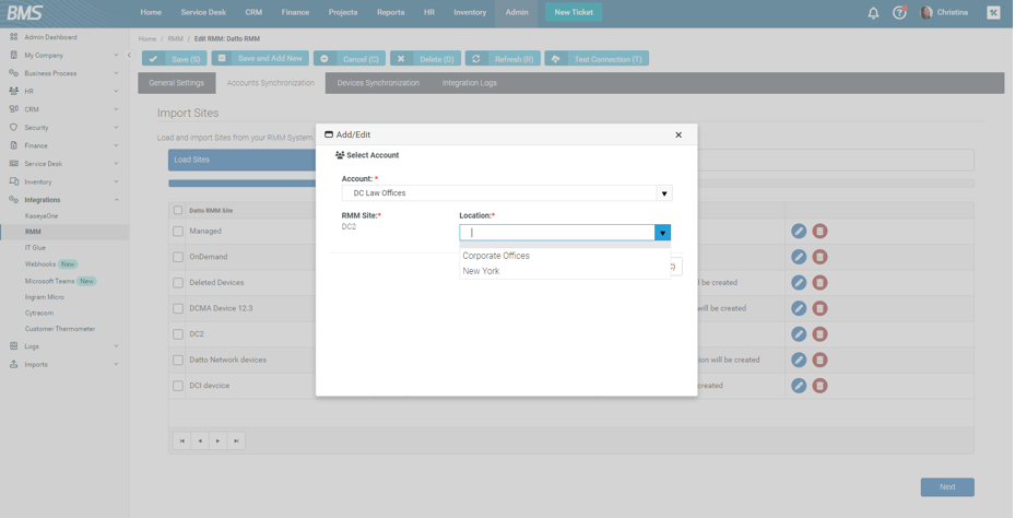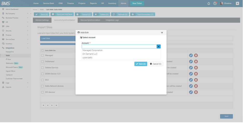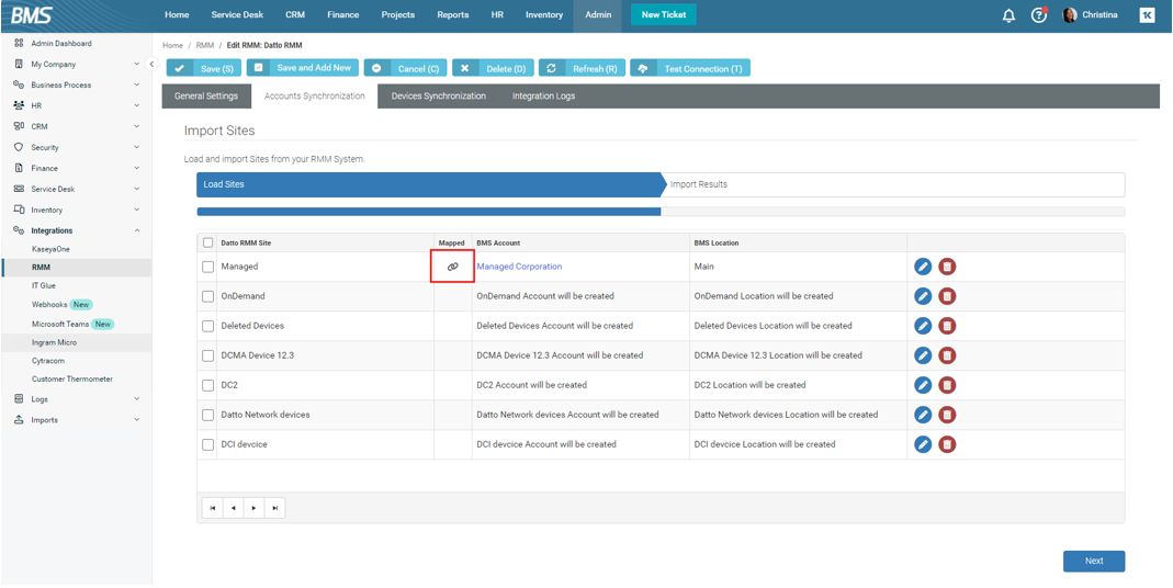 This functionality allows you to synchronize and map organizations between BMS and Datto RMM, ensuring consistent and up-to-date data across both platforms.
