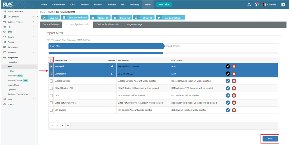 Under BMS Account and Location, you will be automatically offered to have a new account and new location created matching the name of the Datto RMM site. If you would like that option, simply click Next, and these will be mapped under these names.