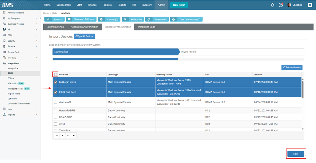 Once you would like to sync/import devices, either check All or select specific devices. Then, click Next.