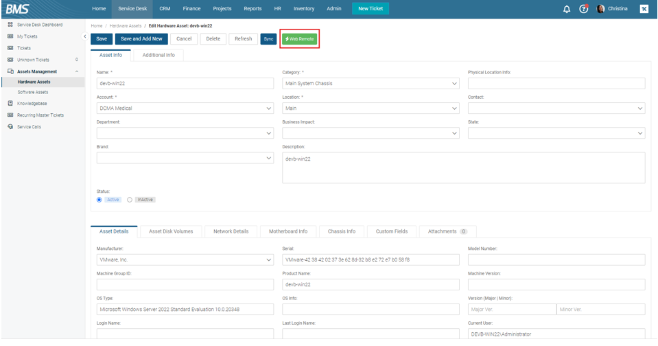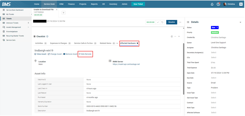 This functionality enables you to remotely access and manage affected hardware devices directly from within BMS, enhancing your remote support capabilities. You can access this functionality from a Service Desk ticket or Hardware Assets section.