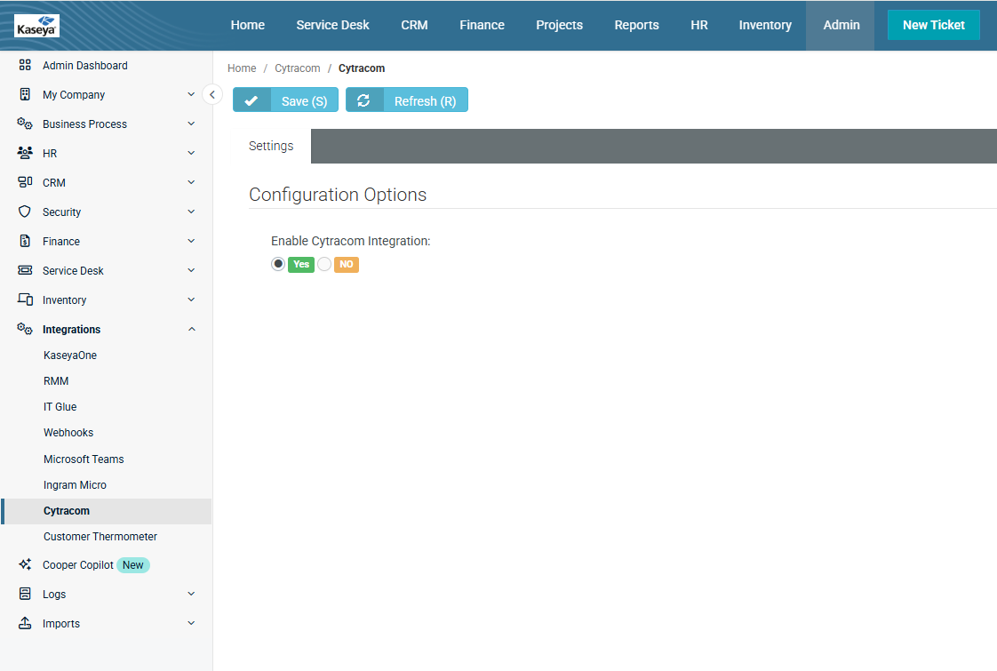 Under the Settings tab > Configuration Options section, click Yes beneath Enable Cytracom Integration option.
