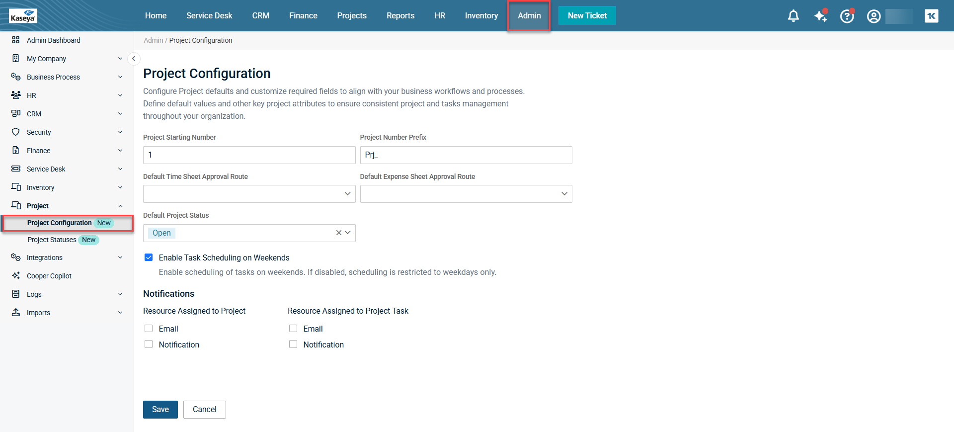 The Project Configuration page allows you to configure settings (such as defaults and customization of required fields) for your Projects module. Previously, these settings were found under Admin > My Company > Company Settings > Projects. We now have a dedicated Project Configuration page exclusively for configuring settings separately under Admin. (See the navigation path above.) These settings influence the behavior and characteristics of a project.