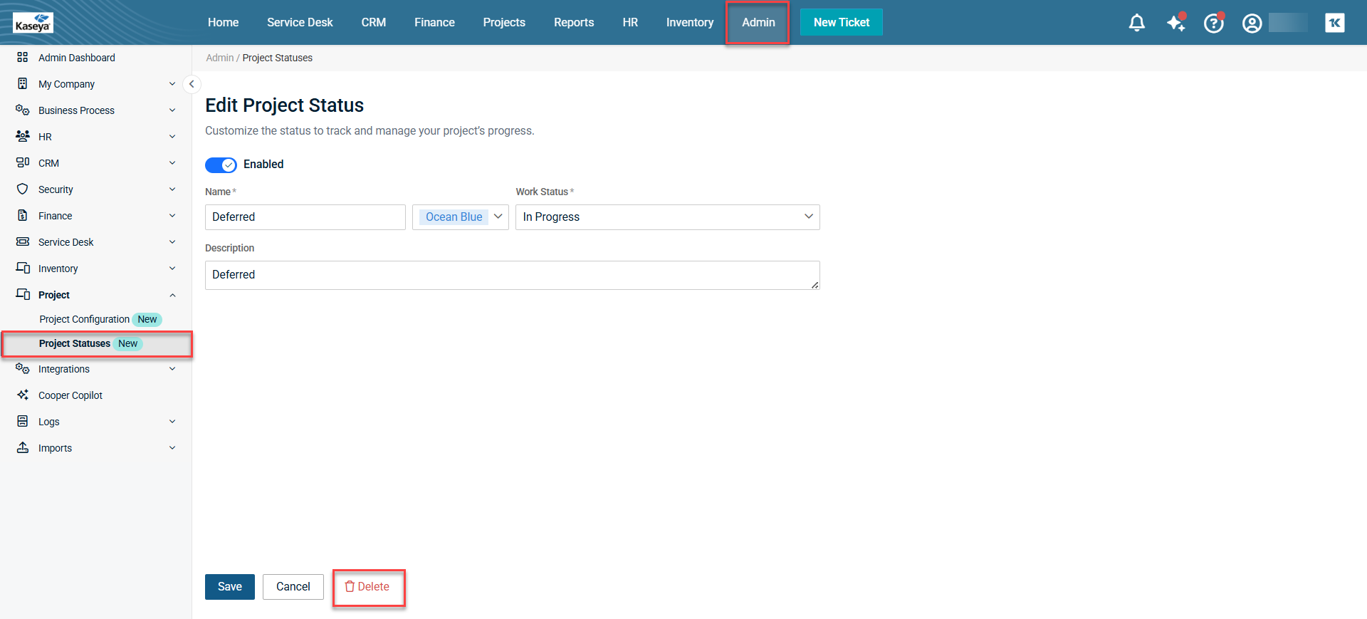 NOTE You cannot delete system statuses or statuses that are currently assigned to projects. However, you can delete an admin-created custom project status.