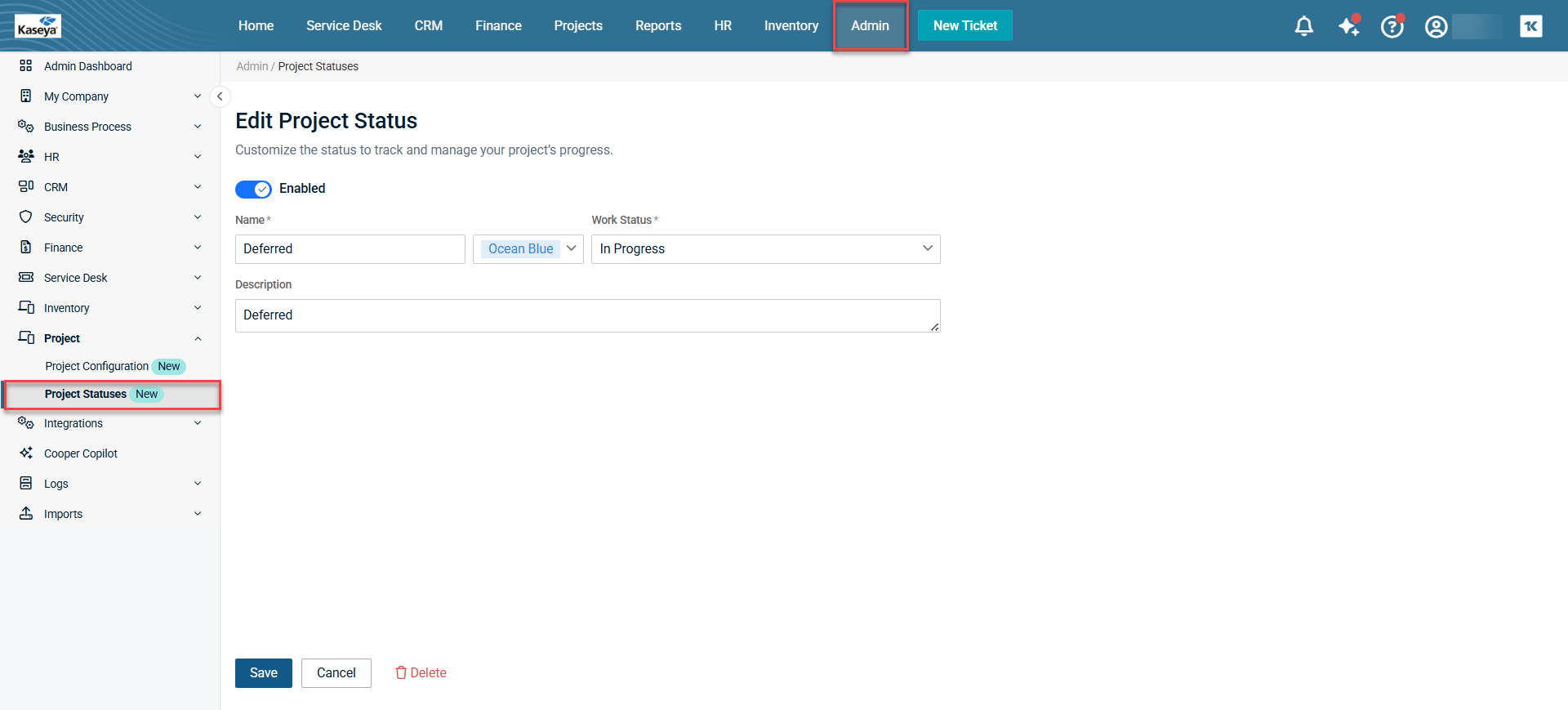 NOTE If you are editing a system status, you cannot edit the Enabled/Disabled status and Work Status field. However, if you are editing an admin-created custom project status, all fields are editable.