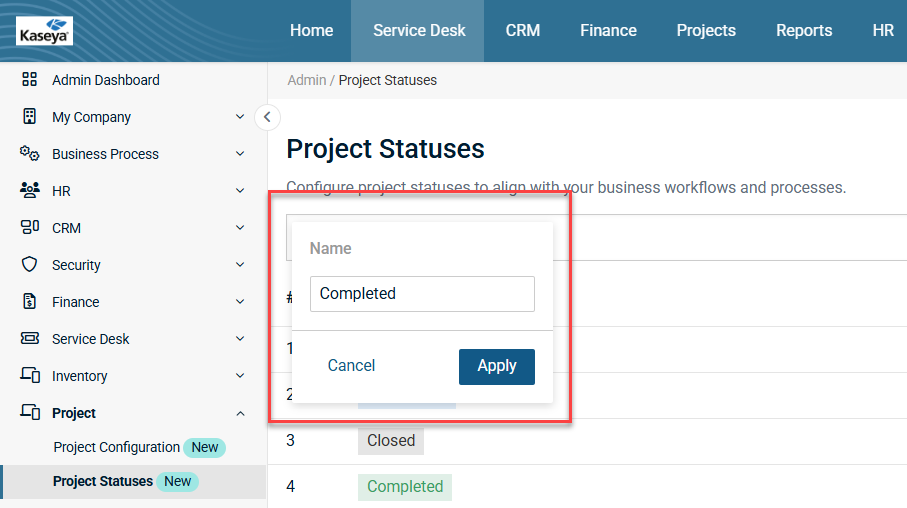 NOTE You can save a custom project status even if you disable it. It will still be listed on the Project Statuses page, but it will show the status as Inactive.