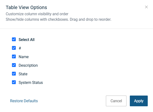 Select or clear as many columns as you want. You can drag and drop the columns to change the order in which they appear in the table. Your table view selections will persist if you navigate away from the page and return to it.