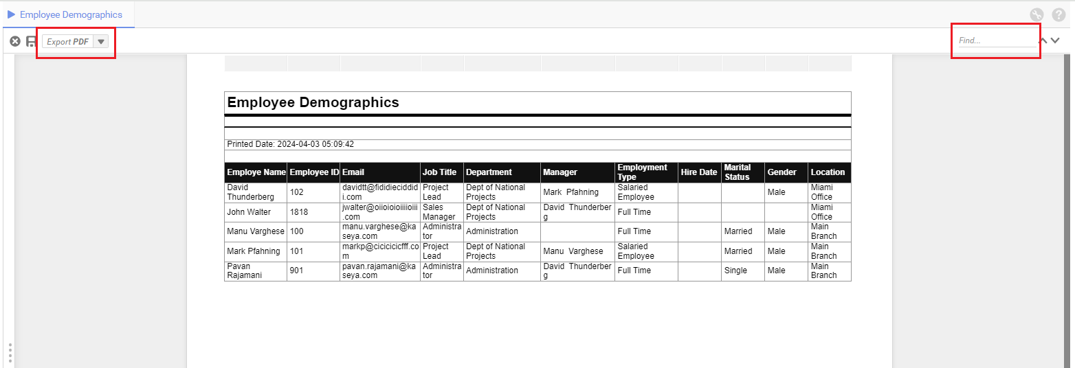 You can export the report as an Excel, PDF, RTF, or CSV file. To export the report, click the Export dropdown on the top left, right next to Employee Demographics.