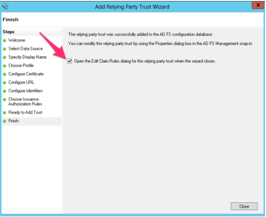 - On the final screen, make sure the Open the Edit Claim Rules dialog for this relying party trust when the wizard closes checkbox is selected and click Finish. This opens the claim rule editor.