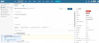 Technician B will see this banner if the technician A changes the title, the description, or if there is any change in the Activities tab, Notes section, in time entry, or in the right panel called Details. When technician B clicks Refresh, technician B will see the change in the description of the title. Technician B will be taken directly to the place of change without scrolling.