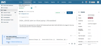 If the description or a title of a ticket is edited and saved by technician A, technician B and others, if any, will see a small banner popping up at the left bottom of their screen with two options - Refresh and Refresh and Show Log.
